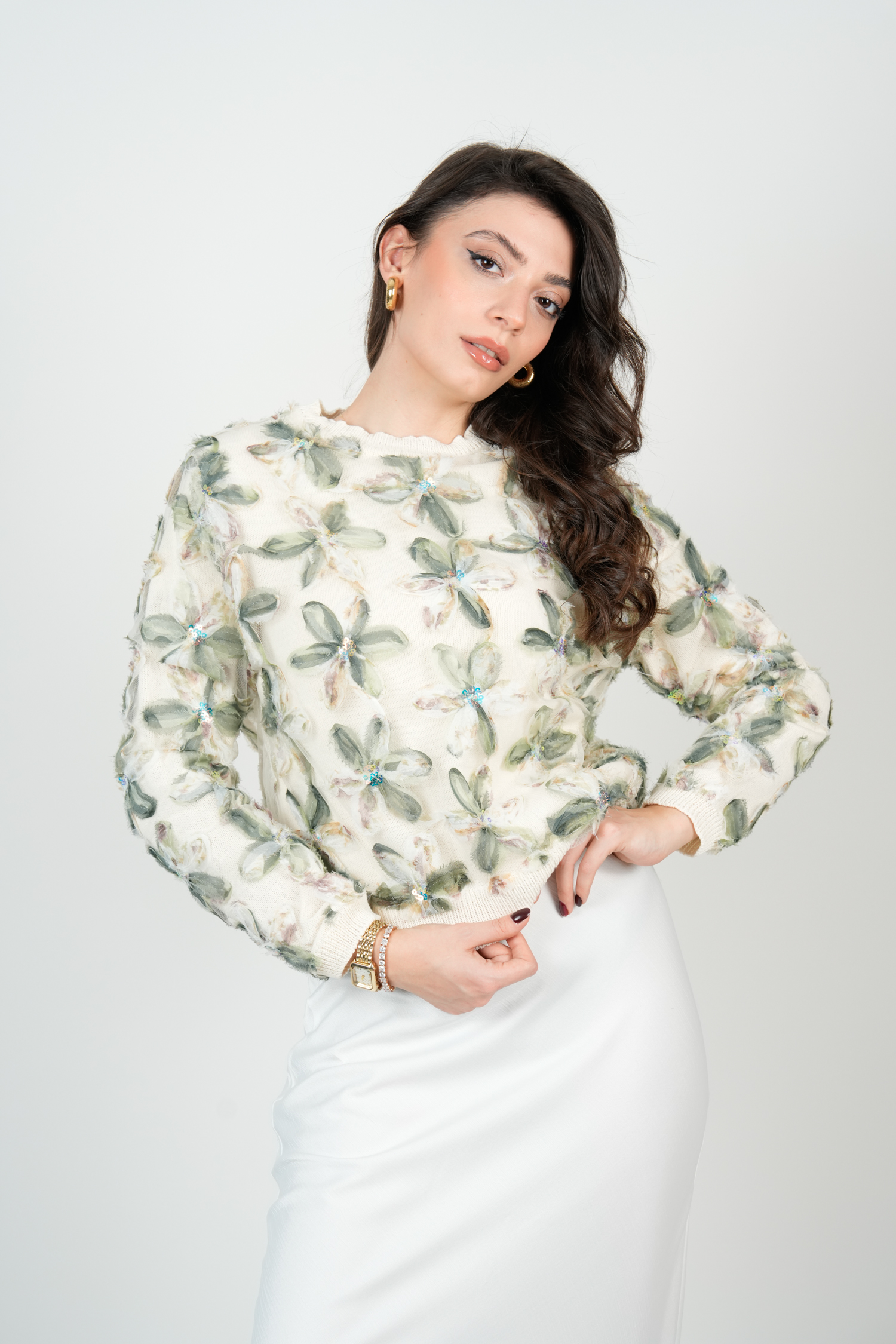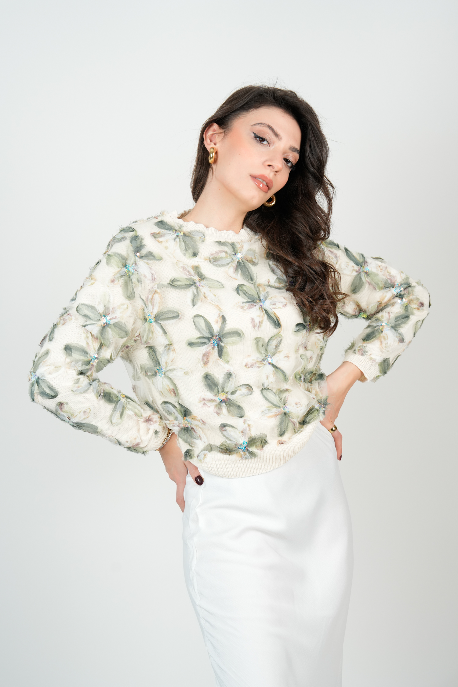 Çiçekli Triko Kazak – Yeşil