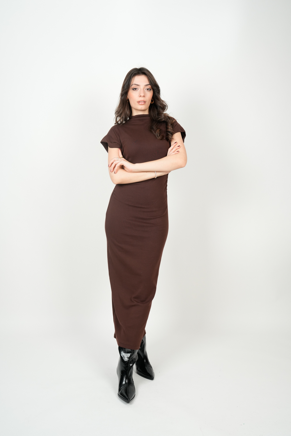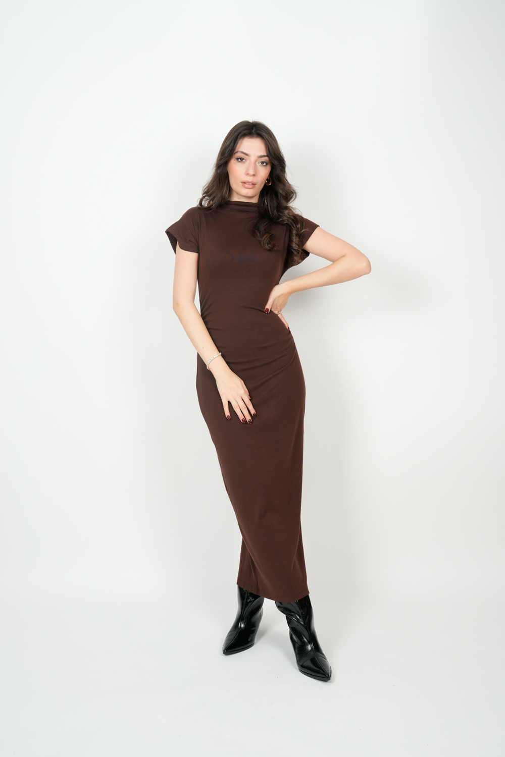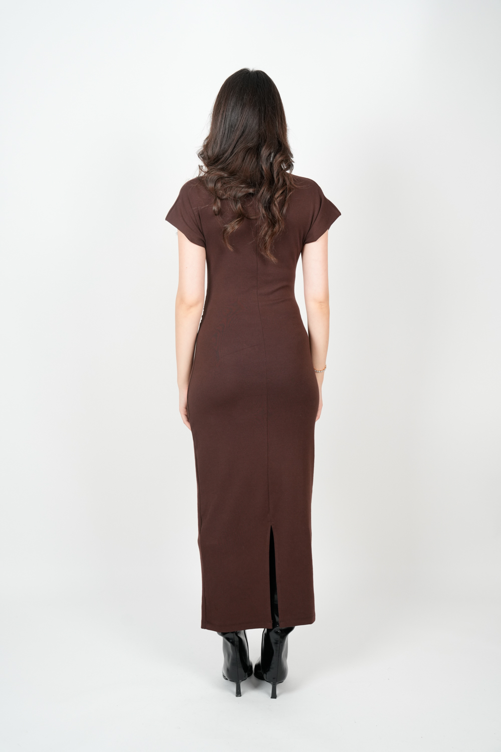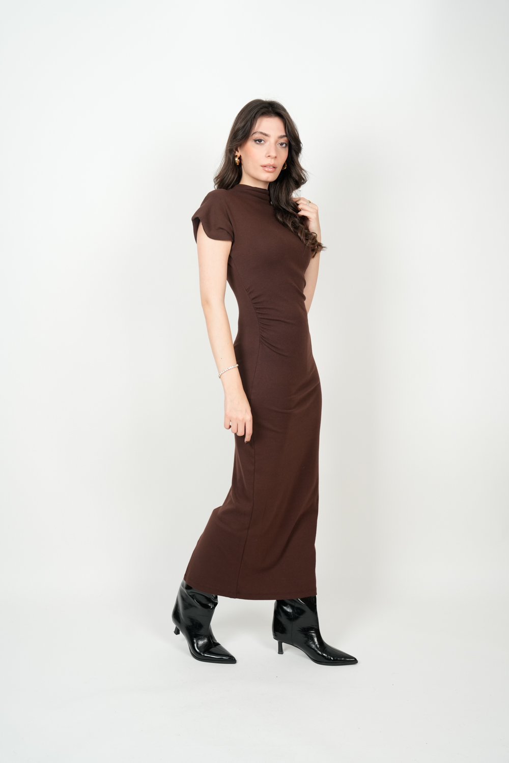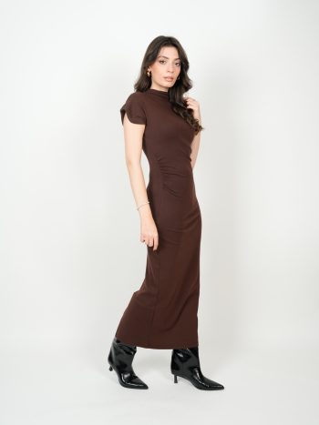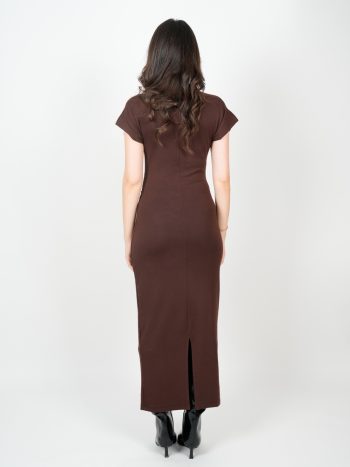 Düşük Omuz Detay Yırtmaçlı Midi Boy Elbise